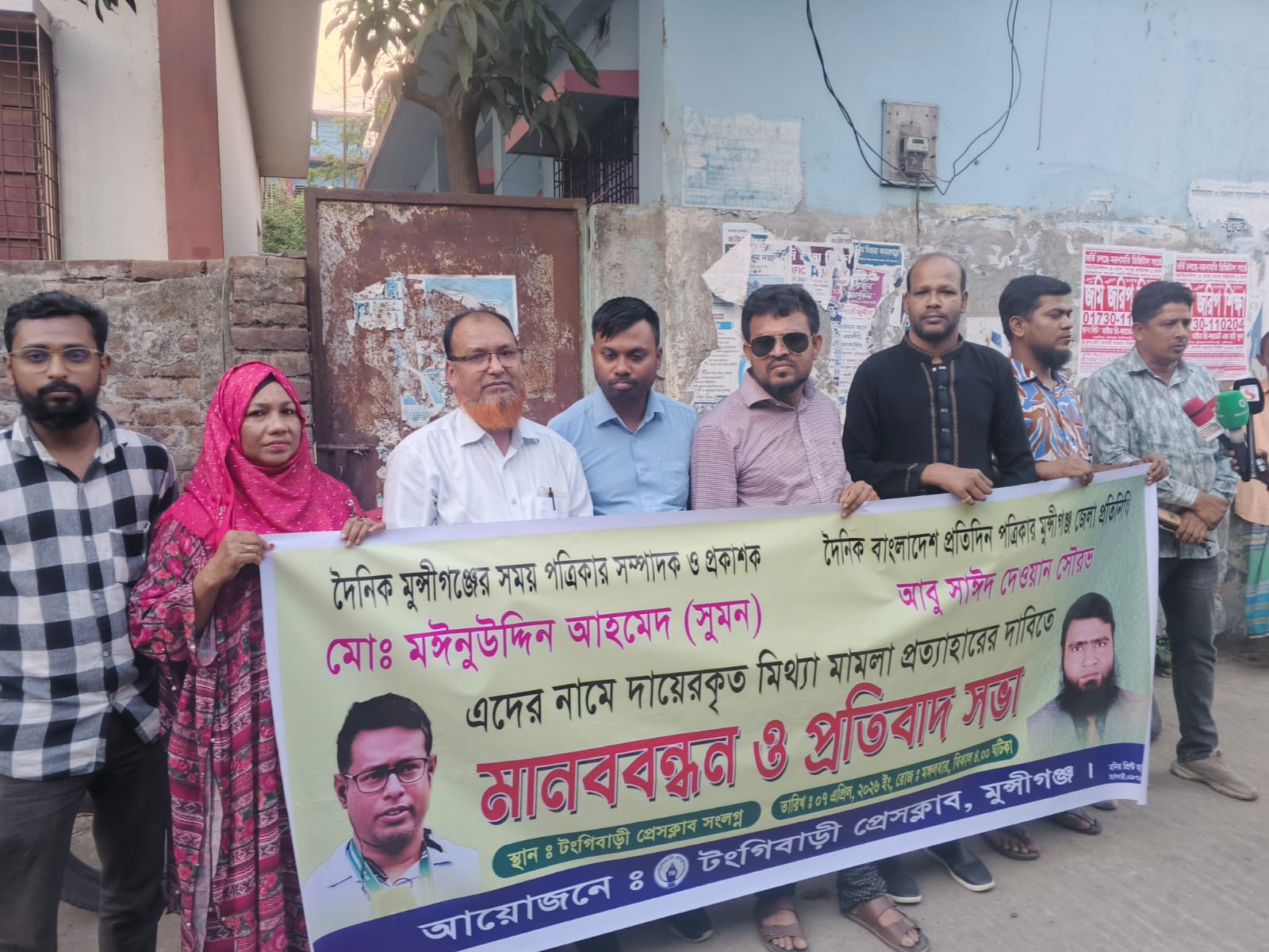নিজস্ব প্রতিবেদকঃ মুন্সীগঞ্জের টঙ্গীবাড়ীতে সাংবাদিকদের বিরুদ্ধে দায়ের করা কথিত মিথ্যা মামলা প্রত্যাহারের দাবিতে মানববন্ধন কর্মসূচি অনুষ্ঠিত হয়েছে। টঙ্গীবাড়ী প্রেসক্লাবের উদ্যোগে আয়োজিত এ কর্মসূচিতে স্থানীয় সাংবাদিক ও গণমাধ্যমকর্মীরা অংশ নেন। মঙ্গলবার (৭ এপ্রিল) বিকেল ৫টায় প্রেসক্লাবের সামনে অনুষ্ঠিত মানববন্ধনে বক্তারা